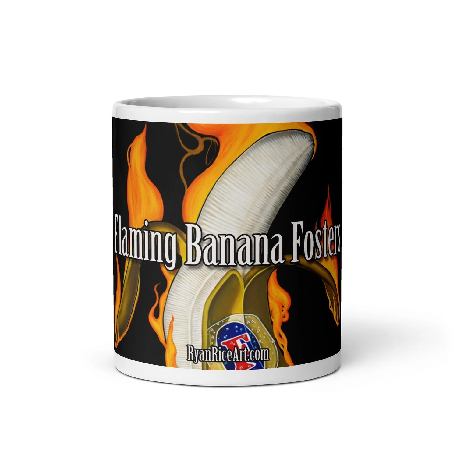 "Flaming Banana Fosters" is based on the popular New Orleans dessert. Typically the dessert is referred to as 'flaming bananas foster' or ‘bananas foster’. I took artistic license and moved the plural form 's' from the end of 'banana' and added it to the end of 'foster' to make it 'Fosters’, which is also the name of a popular Australian beer. An added touch, I painted condensation droplets on the Fosters label to give the indication that it is cold.